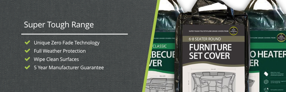 The Super Tough garden furniture cover range features our unique zero fade technology, full UV protection against the sun for longer life and a wipe clean surface. Made from multi-layered cross laminated polyethylene grade material and designed to cover and protect your outdoor valubles.